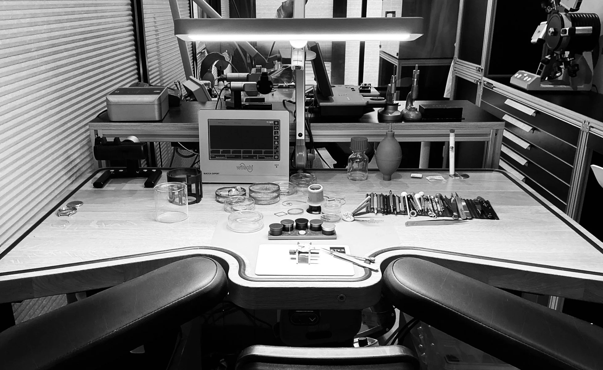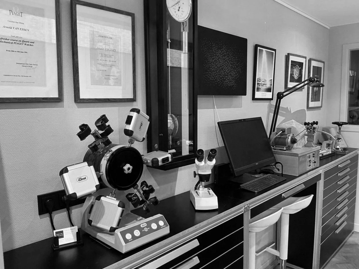 Controle/afregelen van uurwerk. Bij mechanische horloges in de zogenaamde 6 posities. Hiervoor maken we gebruik van de zeer geavanceerde Witschi Analyzer Twin en de Witschi Watch Expert. Behalve mechanische horloges met Zwitserse ankergang, Omega co-axiaal en Audemars Piguet gangsystemen, kan deze Zwitserse machine óók álle noodzakelijke testen aan quartzuurwerken uitvoeren.