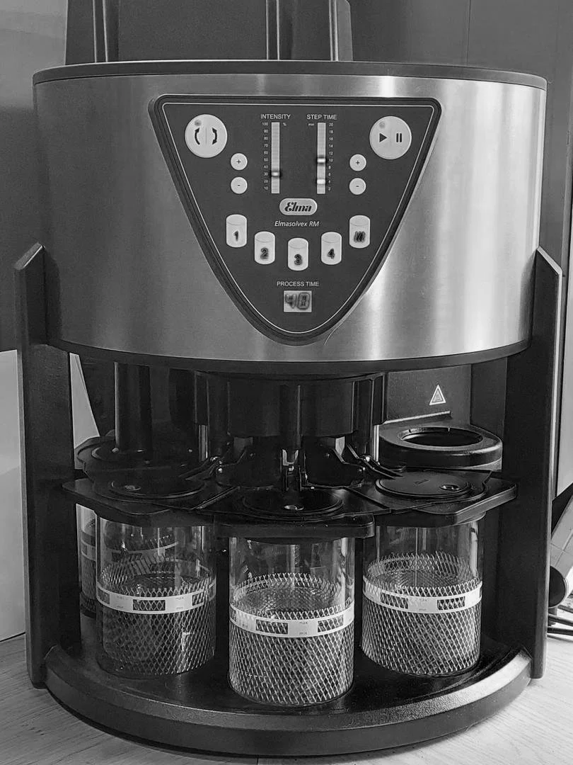Hiervoor gebruiken we de volautomatische ELMA Solvex RM met 1 voorspoelbad, 3 naspoelbaden en een droogkamer.